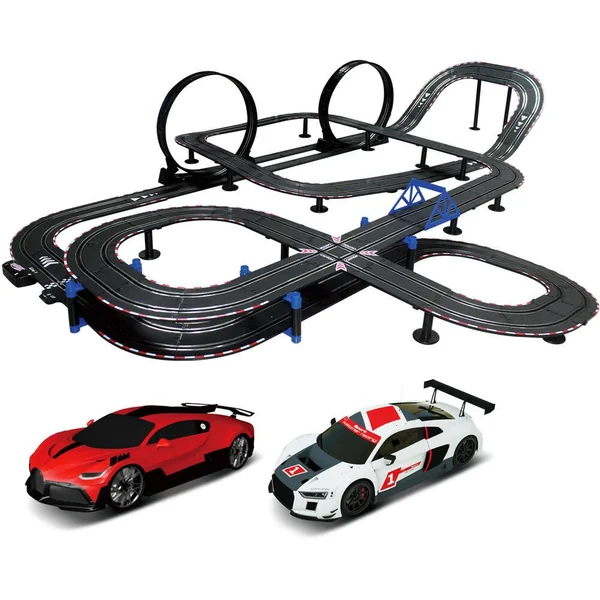 Ce Circuit de course géant présente une piste de 13,5 mètres à l’échelle 1:43, idéal pour reproduire des courses réalistes. Inclus avec le circuit, deux voitures lumineuses sous licence Bugatti et Audi, permettant de vivre des aventures époustouflantes. La piste à deux rainures est accompagnée de rails, d’un double looping et d’un virage surélevé, pour des défis passionnants à chaque tour.