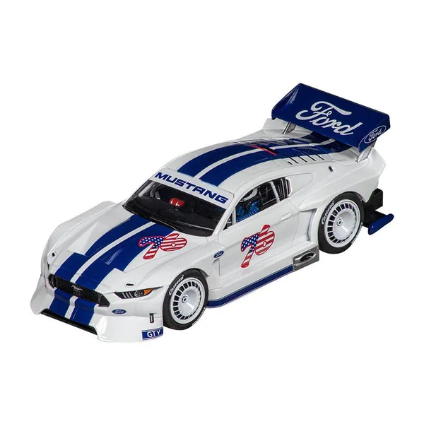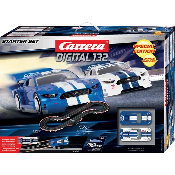 Dans la Carrera DIGITAL 132 « Starter Set », deux bêtes américaines classiques prennent le départ. L’ensemble de pistes de course adapté aux débutants comprend la Ford Mustang GTY « No.5 », qui est marquée en bleu chic avec les rayures blanches distinctives, ainsi que la Ford Mustang GTY « No.76 », qui roule également sur la ligne de départ dans les couleurs de course américaines classiques en peinture blanche avec rigidité bleue.