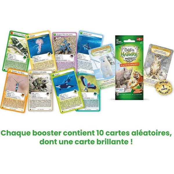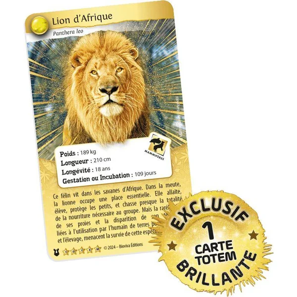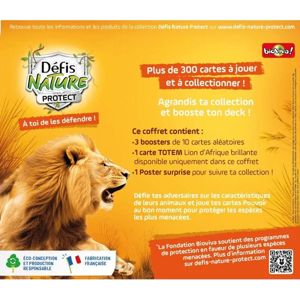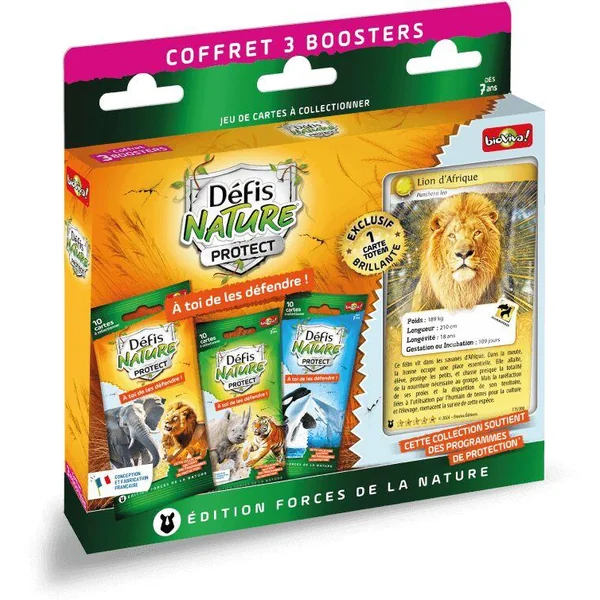 Enrichis ta collection et booste ton deck grâce à 3 boosters de 10 cartes aléatoires. Inclut la carte Totem Lion d’Afrique uniquement disponible dans ce coffret. Avec Défis Nature Protect, Bioviva soutien des programmes de protection sur le terrain.