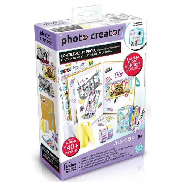 Un coffret avec un album photo à décorer pour ranger toutes ses photos prises avec l’appareil instantané Photo Creator ! Inclus également 2 rouleaux de papier, 2 rouleaux adhésifs colorés, 2 planches d’autocollants et 20 cadres à coller sur les photos !