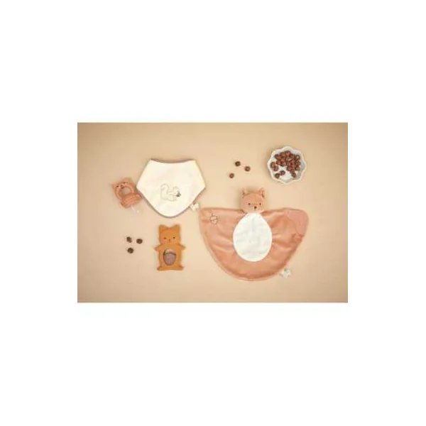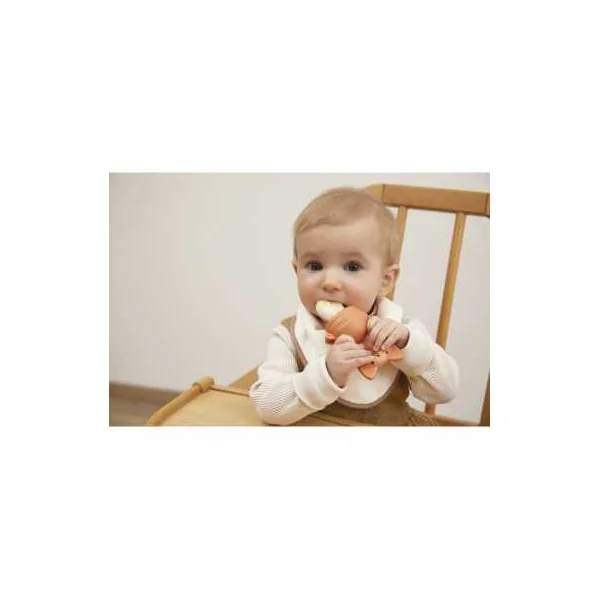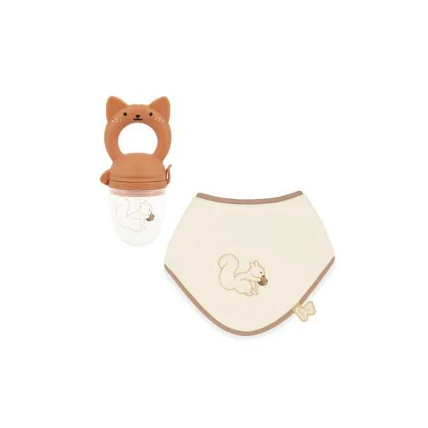 Un joli cadeau de naissance comprenant une grignoteuse en forme d’écureuil et un bavoir assorti. La grignoteuse permet d’introduire facilement des morceaux de fruits ou de légumes, éveillant la curiosité de bébé et son envie de mâcher. Sa forme ludique et ergonomique la rend facile à manipuler pour bébé et soulage les gencives pendant les poussées dentaires.