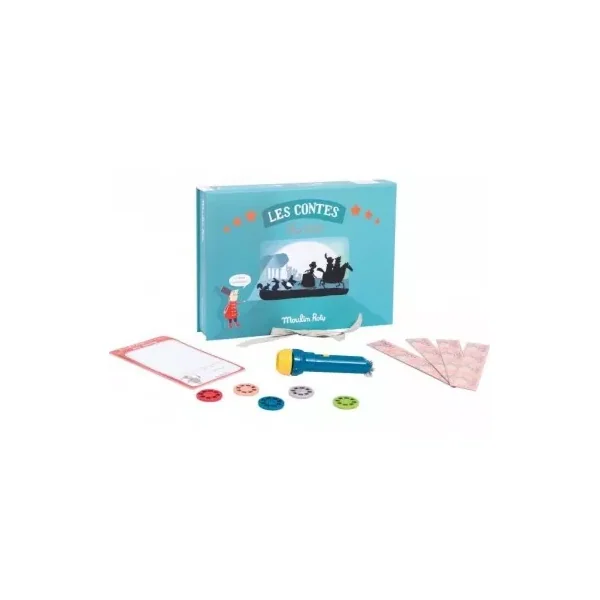 Découvrez le coffret cinema 5 contes de Moulin Roty, un coffret avec une lampe à histoires pour projeter 5 histoires sur un écran blanc pour faire comme au cinema à partir de 4 ans.
