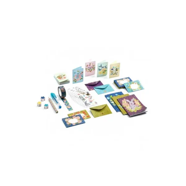 Découvrez le coffret de papeterie Elodie de Lovely paper by Djeco, un mini coffret de papeterie avec de belles illustrations, renfermant 5 petites cartes et 5 petites enveloppes illustrées.