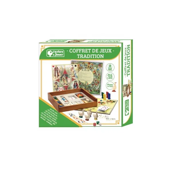 Découvrez le coffret de jeux tradition de Jeujura, un splendide coffret de jeux de sociétés. 8 jeux classiques se glissent dans ce coffret en bois illustré à l’ancienne pour les enfants à partir de 5 ans de la collection l’Arbre à jouer.