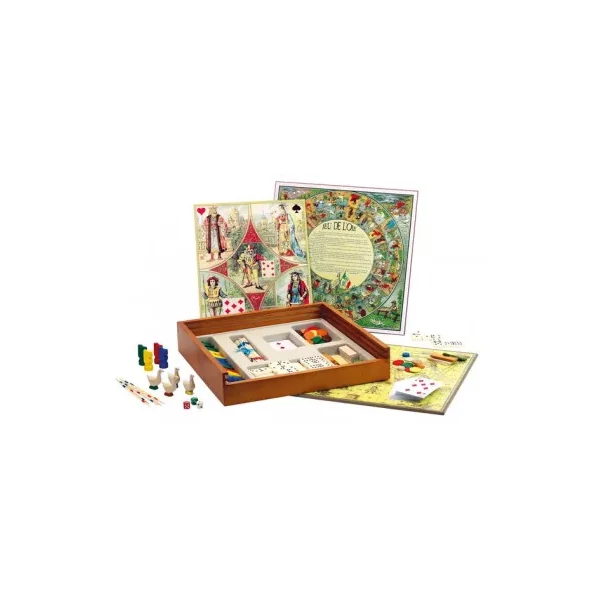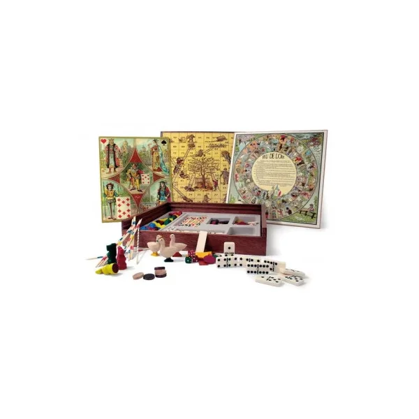 Les enfants et les adultes redécouvriront les jeux de sociétés de leur enfance, le classique jeu des petits chevaux, le jeu de l’oie, le jeu du moulin, le jeu des échelles, le nain jaune, le mikado, les dominos et un jeu de 54 cartes. Traditionnel et illustré à l’ancienne, ce coffret en bois renferme tous les jeux classiques indispensables à avoir chez soi. La mallette de jeux à trouver dans toutes les maisons.