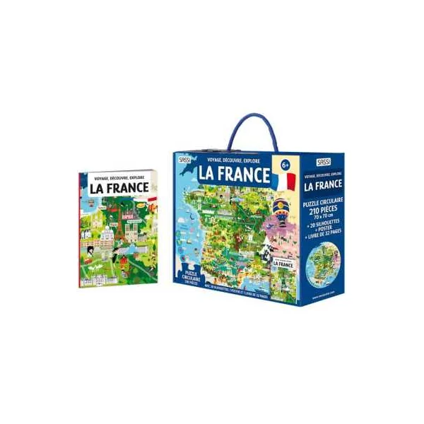 Découvrez le coffret livre et puzzle La France de Sassi, un cadeau à partir de 6 ans comprenant un livre de 32 pages, un puzzle rond de 210 pièces accompagné de 20 silhouettes à construire pour voyager, découvrir et explorer notre beau pays la France.
