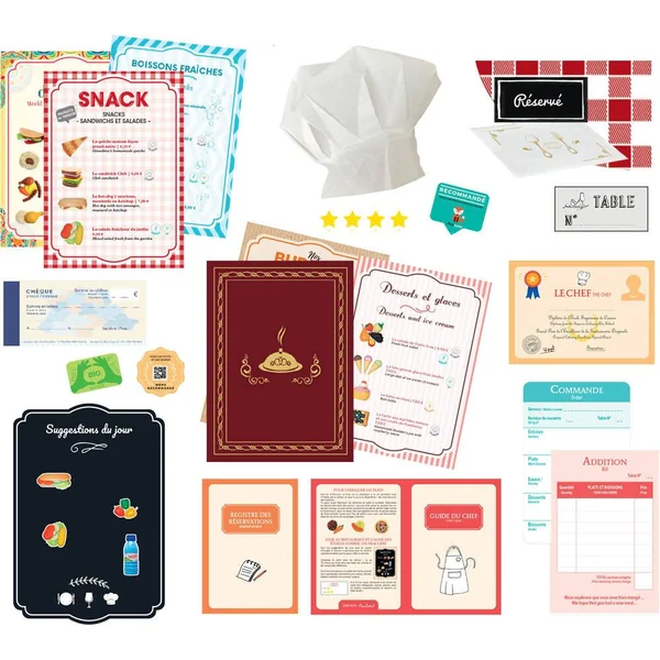 Recrée à la maison l’ambiance d’un vrai restaurant . Plus de 30 accessoires : Carte imitation cuir et des menus variés (bistro, burgers, desserts ,snack, coffee shop..), ardoise du jour à illustrer avec les stickers repositionnables, réservations, guide du chef, carnet de commandes, additions, carnet de chèques…