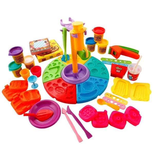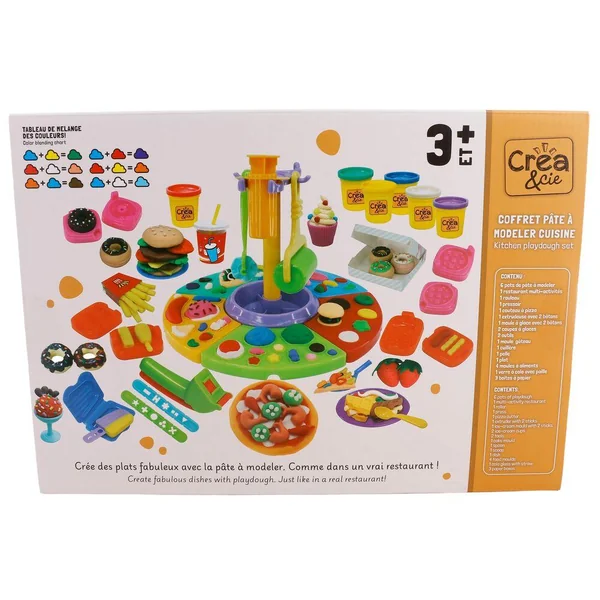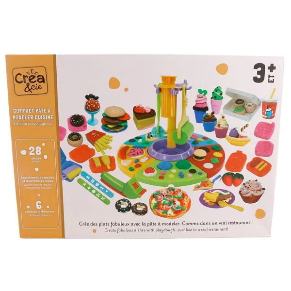 Dans ce coffret se cachent 28 articles de cuisine dont, 1 restaurant multi-activités, 1 rouleau, 1 pressoir, 1 couteau à pizza, 1 extrudeuse avec 2 bâtons, 1 moule à glace avec 2 bâtons et 2 coupes à glace. Cette boîte se compose également de 2 outils, 1 moule à gâteau, 1 cuillère, 1 pelle, 1 plat, 4 moules à aliments et 1 verre à cola avec paille. Vous y trouverez aussi 6 pots de pâte à modeler de 55 grammes et 3 boîtes à papier.