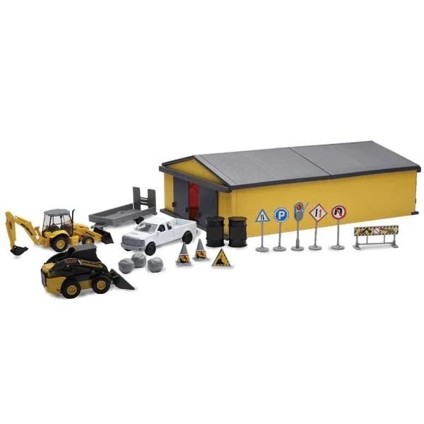Coffret T.P. die cast contenant les répliques officielles de la mini-chargeuse L230, du tractopelle B110C, d’un pick-up avec remorque porte-engins et de divers accessoires de signalisation de chantier.