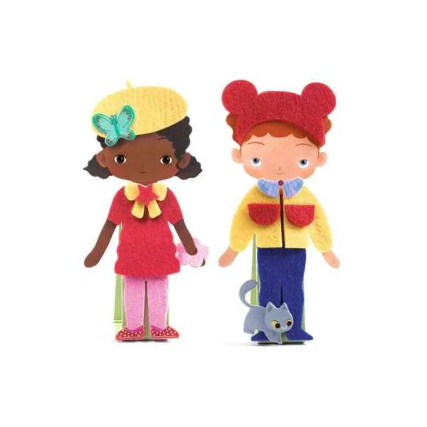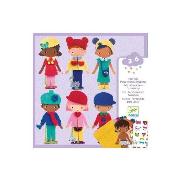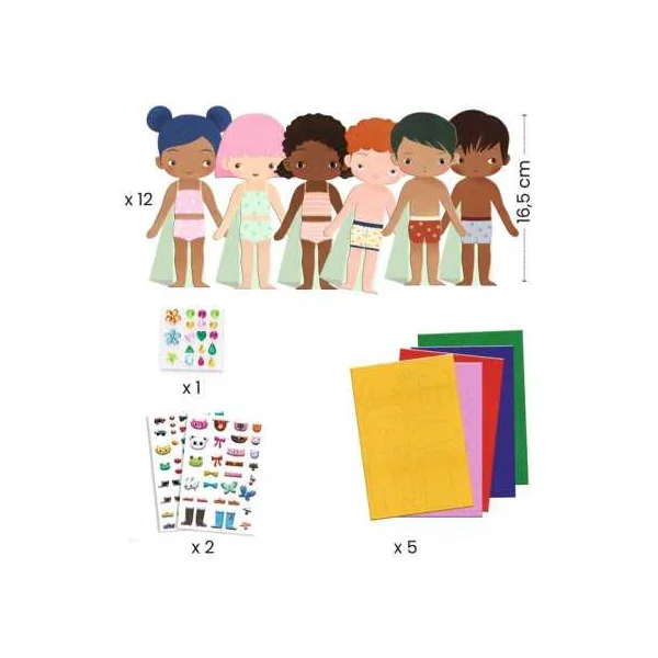 Ce coffret ludique permet aux petits de s’amuser à habiller 12 personnages, composés de 6 garçons et 6 filles, en utilisant des vêtements et accessoires en feutrine autocollante. Les personnages, réalisés en carte épaisse, tiennent debout pour faciliter la manipulation et encourager les jeux de rôle. Avec 5 planches de feutrine colorée, ainsi que 2 planches de stickers, les enfants peuvent laisser libre cours à leur créativité. Un livret explicatif accompagne le tout pour inspirer des idées d’associations.