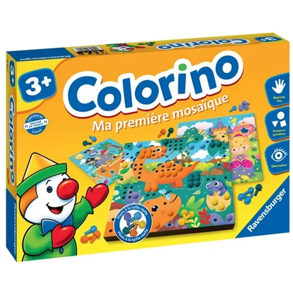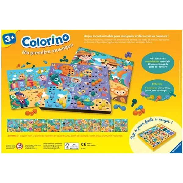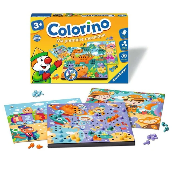 Colorino Ma première mosaïque développe la motricité fine et l’imagination de l’enfant dans un univers haut en couleur. Avec de nouvelles thématiques et des couleurs plus modernes, votre enfant sera en mesure de s’épanouir et de développer sa créativité sans limite. L’enfant pourra voyager dans l’espace, marcher dans les pas des grands dinosaures, découvrir le château des princesses et même prendre de la hauteur avec ses amies les fées.
