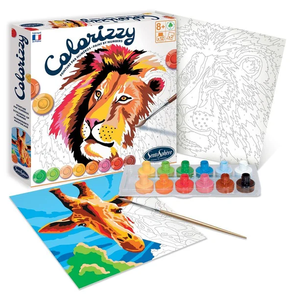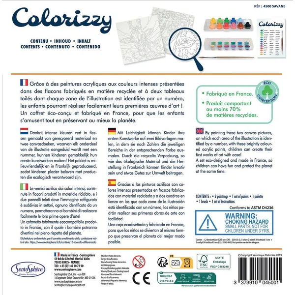 Cette gamme de peintures par numéros a été réalisée avec des designs simples et adaptés aux jeunes artistes. Les pots très stables, fabriqués en matière recyclée, contiennent une peinture acrylique en pigments qui permet de créer ses premières oeuvres d’art avec des couleurs vibrantes et couvrantes. Ils seront guidés par des contours et des numéros qui disparaîtront parfaitement sous une couche de peinture. Petit à petit, le tableau prendra vie à chaque couleur ajoutée. Un coffret éco-conçu et fabriqué en France, pour que les enfants s’amusent tout en préservant au mieux la planète. . 2 tableaux en papier toilé contrecollé (22 x 22 cm). 12 couleurs de peintures acryliques non toxiques. 1 pinceau de très grande qualité . 1 palette pour mélanger les peintures. 1 notice multilingue sur la perception des couleurs.