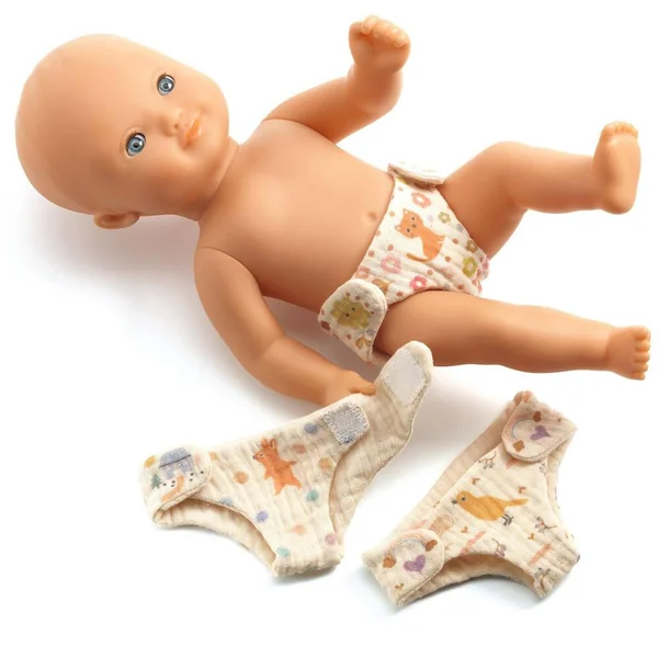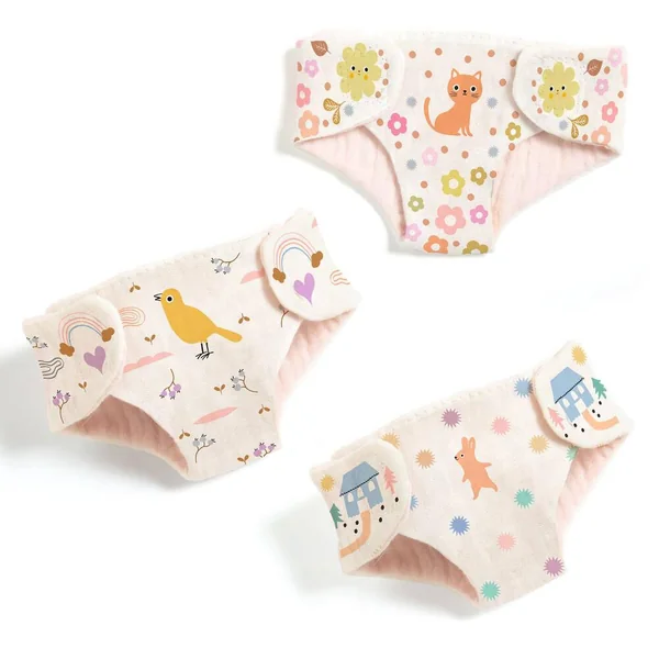 On va changer la couche ! Lot de 3 couches lavables en tissu gaze de coton pour poupons avec fermeture velcro. 3 motifs différents.