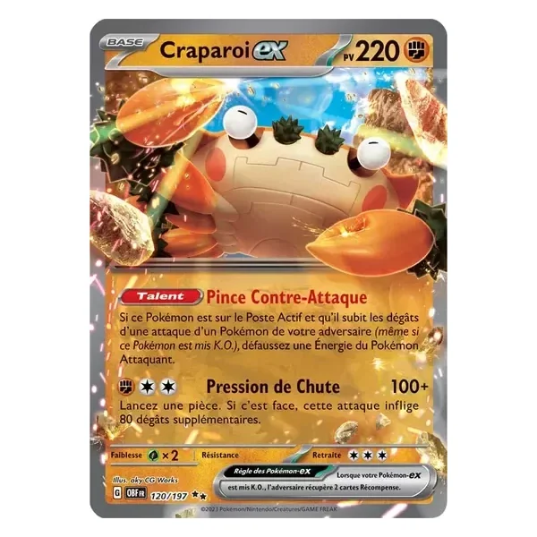 Découvrez Craparoi (obf120), une carte Pokémon de l’extension Flammes Obsidiennes, provenant du bloc Écarlate & Violet. Idéale pour compléter votre collection, cette carte Double Rare plaira autant aux collectionneurs qu’aux joueurs.