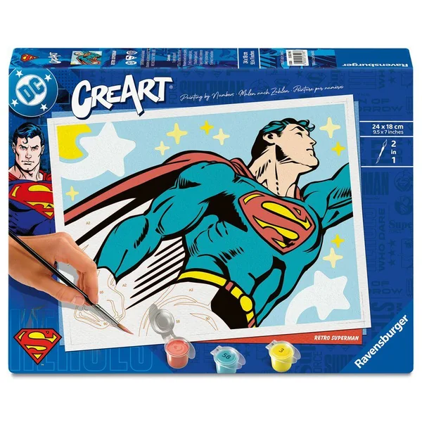 Profitez d’un moment de détente et de relaxation avec la peinture par numéros ! C’est facile, beau et agréable de réaliser soi-même son chef d’œuvre ! Parmi les nombreux visuels grands formats adulte à peindre et à accrocher, ce Superman version retro saura ravir les passionnés et compléter leurs collections ! Idéal à accrocher dans chez soi. Retrouvez d’autres visuels comme des villes, des animaux, des paysages et plus encore. Fabriqué en Allemagne. A partir de 12 ans. Ce produit est composé de matériaux issus de forêts bien gérées certifiées FSC®, de matériaux recyclés et de matériaux issus d’autres sources contrôlées (FSC-C111262).