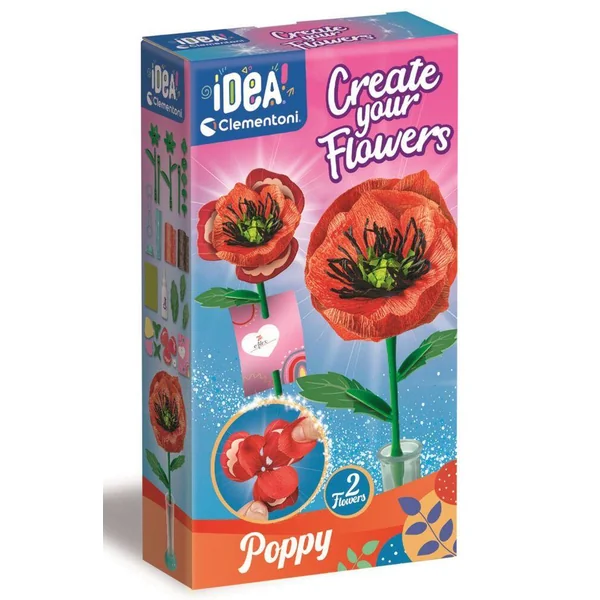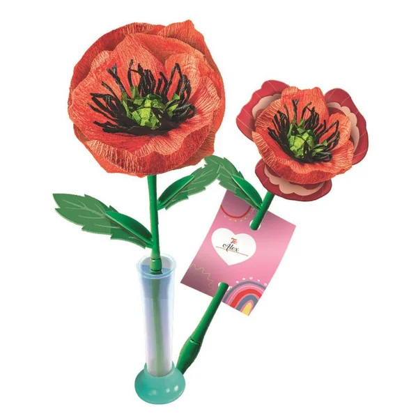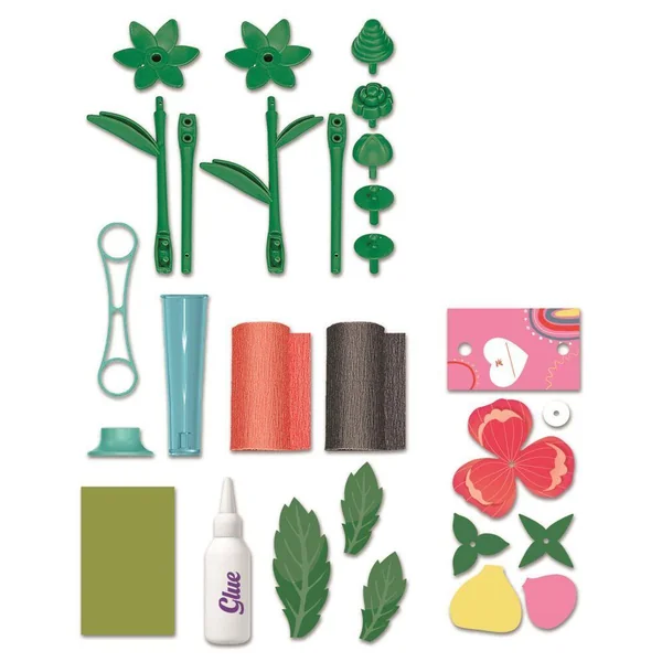 • Un coffret riche contenant : tiges, pétales à colorer, corolles de différentes matières à composer et le porte-fleur à assembler et décorer.