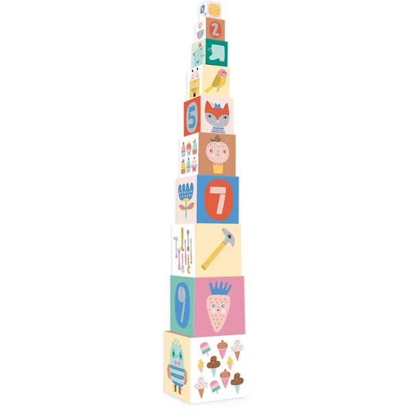 Dix cubes gigognes en carton à empiler – Numérotés de 1 à 10 , pour apprendre à compter, ces jolis cubes kawai-chic illustrés par Suzy Ultman éveillerons les tout-petits .