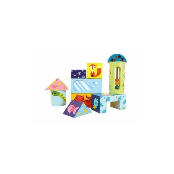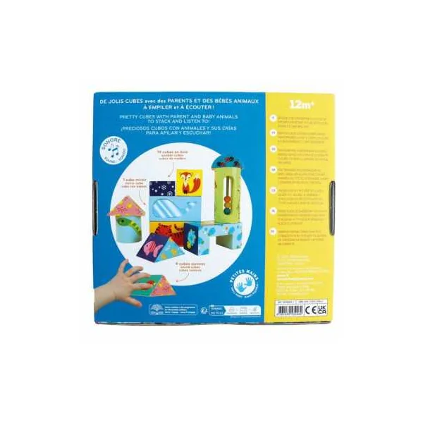 14 cubes en bois pour les enfants à partir de 12 mois : un jouet d’éveil original où les enfants apprendront à manipuler, à empiler et à faire tomber ! Les cubes colorés représentent des animaux. Dotés de billes et grelots, ils sont sonores pour développer l’ouïe du bébé.