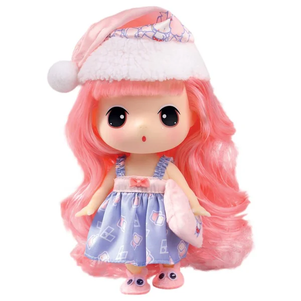 Poupée articulée de 18 cm, en vinyle. Elle porte une tenue de nuit dont une chemise de nuit et des chaussures. Les vêtements sont amovibles. Un portant de présentation inclus permet de faire tenir la poupée debout. Livré dans une boîte fenêtre, dimensions 18.5 x 9.5 x 25 cm.
