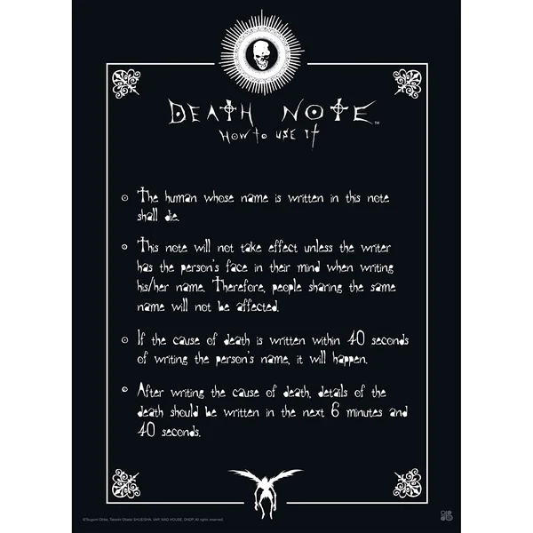 Fans de l’univers sombre et fascinant de , ce poster des règles du Death Note est fait pour vous ! Tiré directement du cahier que Ryuk laisse tomber dans le monde des humains, ce visuel reproduit fidèlement les instructions qui accompagnent ce terrible artefact. Un indispensable pour tous les admirateurs de Light Yagami, L ou tout amateur de thriller surnaturel !