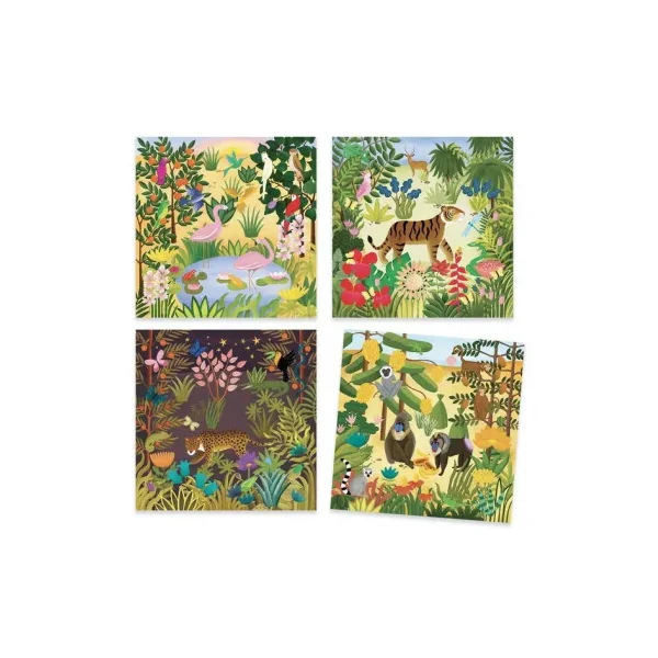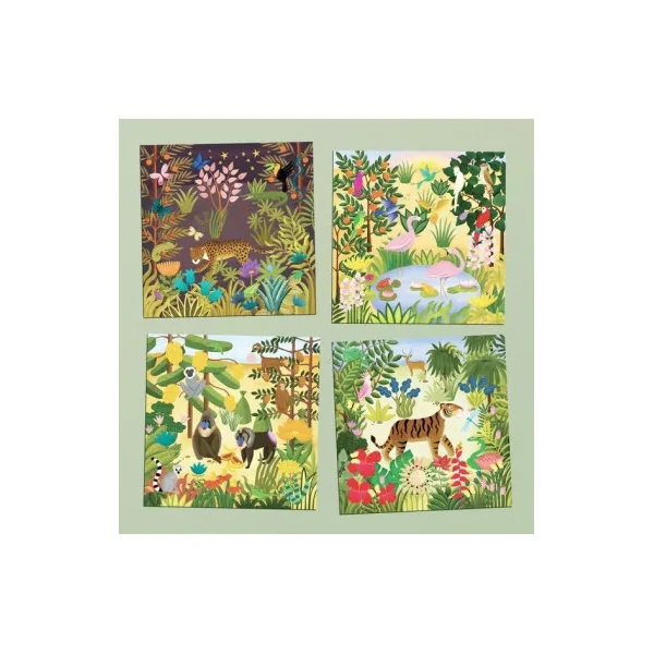 Petit à petit, les images s’ajoutent et se superposent pour composer 4 tableaux représentant des animaux sauvages cachés dans une nature luxuriante!