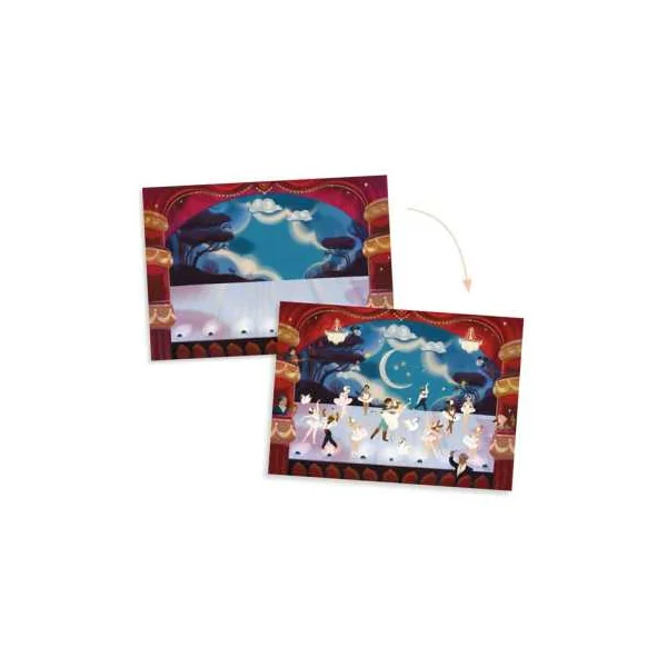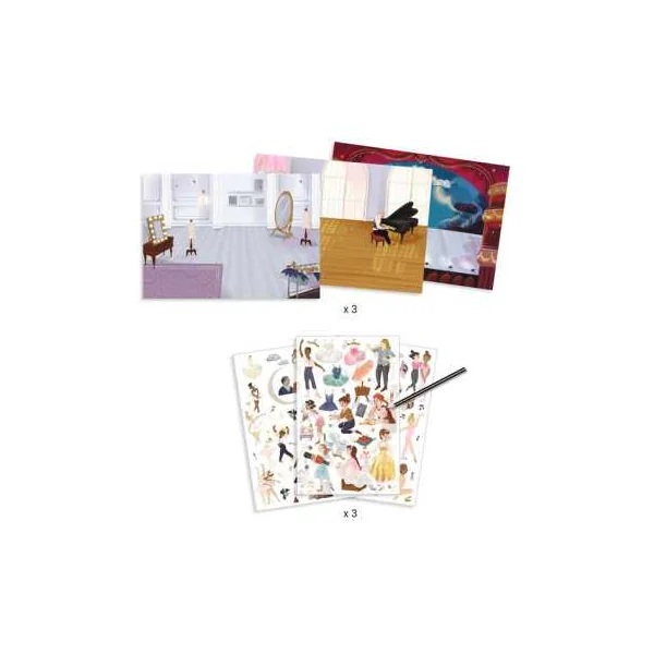 L’enfant choisit l’un des 3 grands décors imprimés, positionne les éléments à transférer, puis frotte les images à l’aide d’un crayon pour les déposer à l’endroit souhaité. Simple et intuitive, cette activité de décalcomanies encourage la liberté de création et permet d’inventer des histoires uniques autour de la danse et du spectacle.