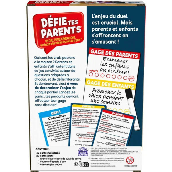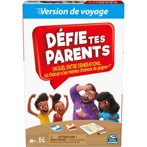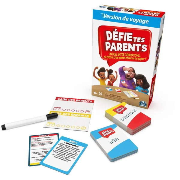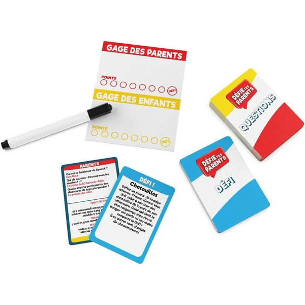 Un jeu simple et ultra convivial construit autour du principe central d’égalité des chances : « Le jeu où les enfants en savent autant que leurs parents » ! Principe du jeu : l’équipe des enfants affrontent celle des parents autour de questions sur mesure et de défis déjantés qui font se lever de table ! Les parents répondent à des questions qui semblent souvent simples à leurs enfants… mais moins à eux ; et les enfants à des questions de culture ou vie pratique dont leurs parents connaissent en général les réponses. Système de « gages » : chaque équipe inscrit au début de la partie sur l’ardoise un gage qu’elle devra réaliser si elle perd… de quoi pimenter l’enjeu de la partie !