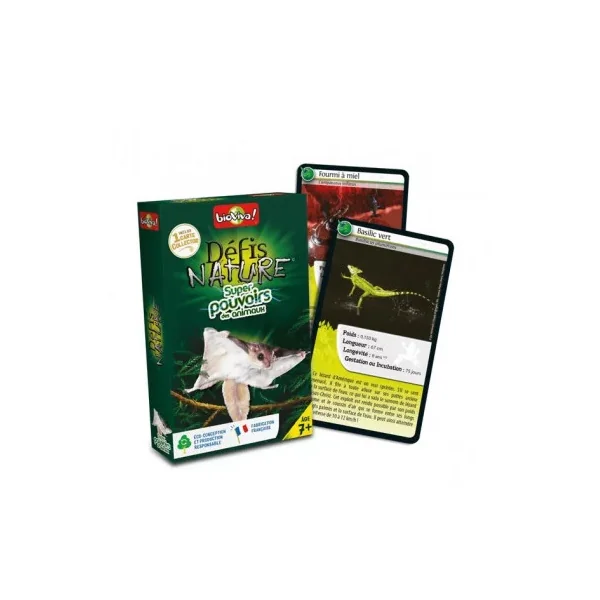 Découvrez Défis nature Super pouvoirs des animaux de Bioviva, un jeu de cartes éducatif à partir de 7 ans, qui vous emmène à la rencontre des animaux les plus surprenants au monde. Découvrez les espèces à préserver, puis pariez sur les points forts de vos animaux pour collecter toutes les cartes du jeu et remporter la partie.