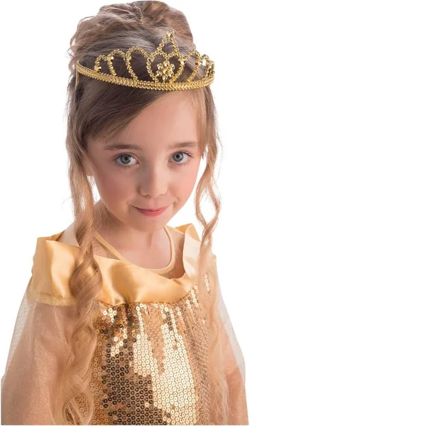 Déguisement de princesse robe couleur or. Contient : 1 robe avec cerceau et 1 diadème en plastique. Le modèle est destiné aux enfants de 5-7 ans. Stature : 120 cm. Tour de poitrine : 62 cm. Tour de taille : 55 cm. Le costume est livré sur cintre dans une housse en organza assortie à la couleur de la robe, dimensions 42 x 5 x 110 cm. Robe : 100 % polyester, lavable à 30°. Chaussures non fournies.