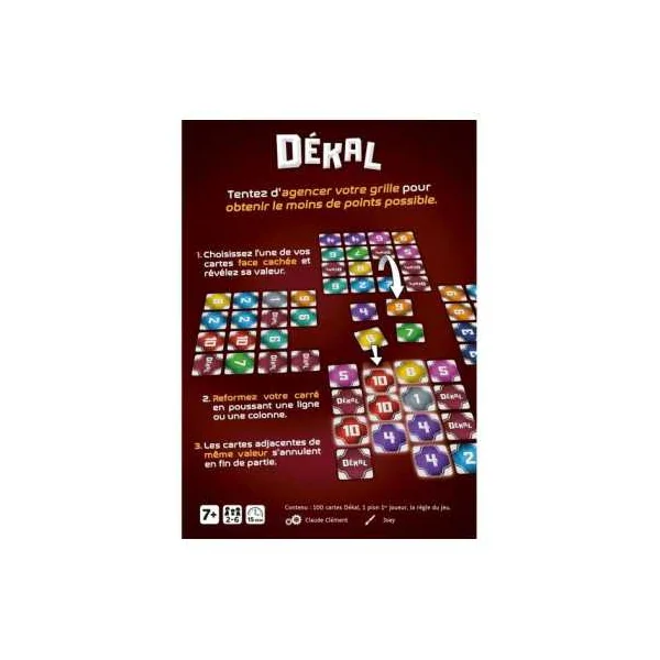 La boite de jeu contient 100 cartes Dékal, 1 pion « 1er joueur » et la règle du jeu.