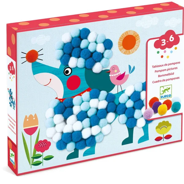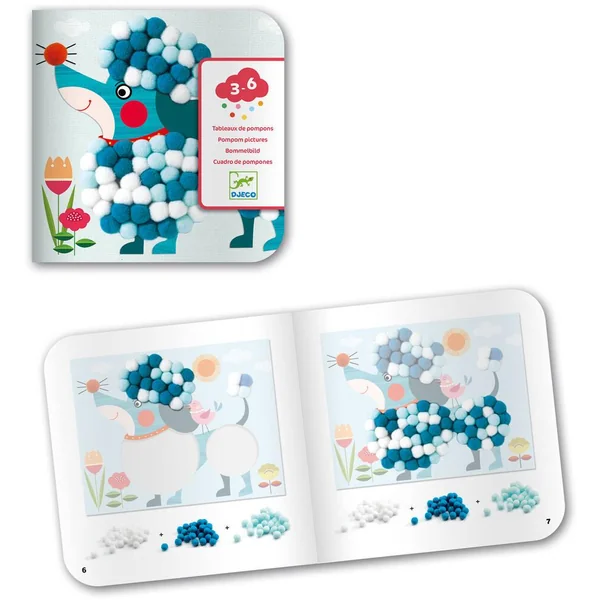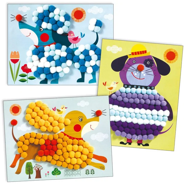 Une activité de collage pour compléter les 3 chiens avec des pompons. En suivant les modèles du livret explicatif, l’enfant colle les pompons colorés sur les parties autocollantes des 3 tableaux illustrés. Surprise, 3 chiens tous doux à caresser apparaissent !