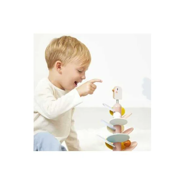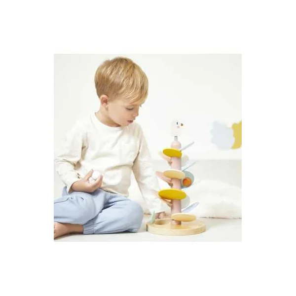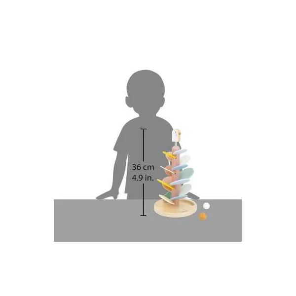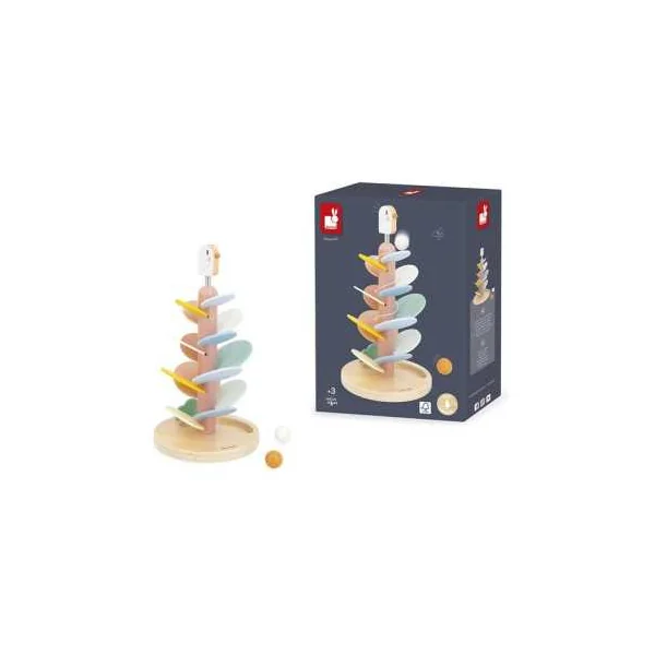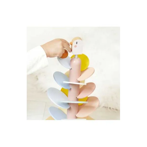 L’oiseau, perché sur un ressort, apporte une touche amusante et dynamique, tandis que deux billes en bois sont incluses pour expérimenter la descente sur les feuilles.