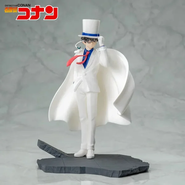 Avec ses 19 cm, la figurine offre une belle présence en vitrine tout en gardant une silhouette fine et élégante. Le costume blanc est soigneusement sculpté (veste, pantalon, gants), et les détails bleus du chapeau et de la cravate ajoutent un contraste net. La cape, très volumineuse, donne du relief et renforce l’effet “apparition”. Le socle sombre, façon plateforme rocheuse, met encore plus en valeur le blanc éclatant de l’ensemble. Une figurine Detective Conan parfaite si vous aimez les pièces qui respirent la classe.