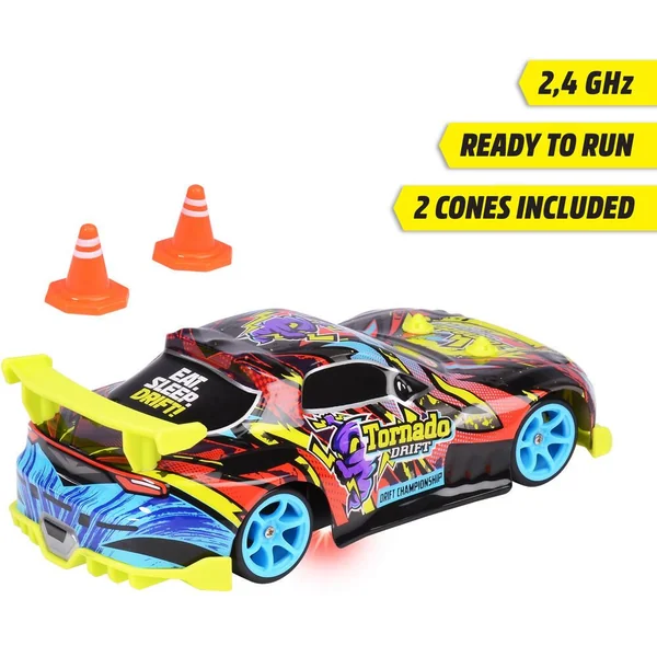 Voiture de course ‘TORNADO DRIFT’. Fonctions drift lorsque la voiture tourne. Carrosserie robuste aux chocs. Chassis lumineux. Fonction complète de pilotage. Technologie 2,4 GHz. Chargeur USB.