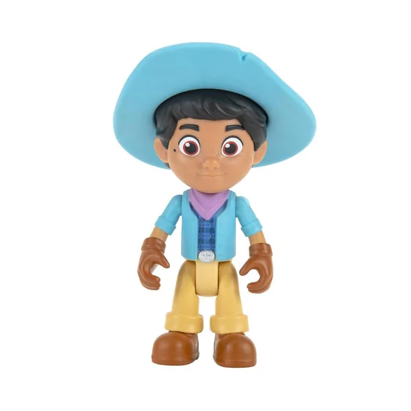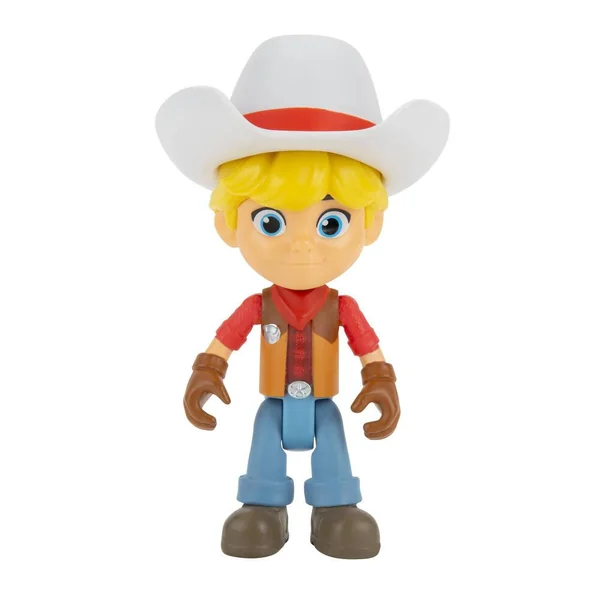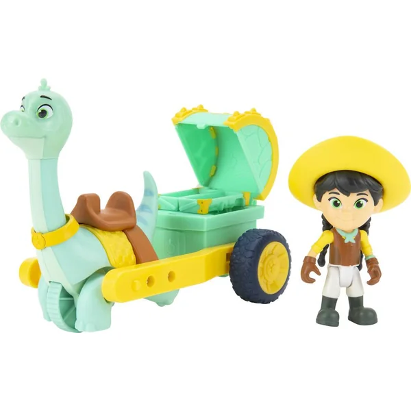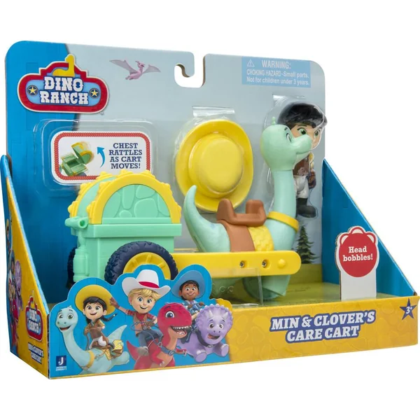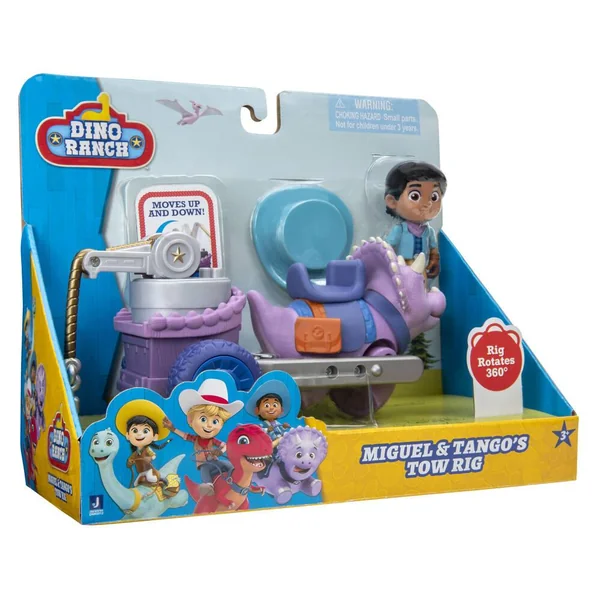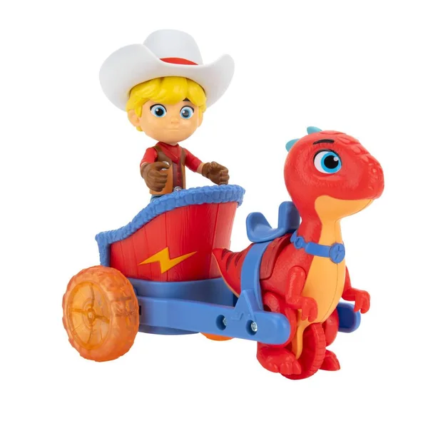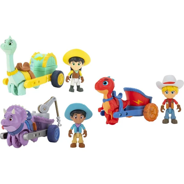 Dino Ranch. Pack de 1 figurine et 1 véhicule Dino. 3 modèles assortis : Jon et le chariot Blitz (Réf. DNR0010), Min et le véhicule médical Clover (Réf. DNR0011), Miguel et la dépanneuse Tango (Réf. DNR0012). Figurine humaine articulée de 7.5 cm. Véhicule avec moteur à rétrofriction. Collectionne-les tous ! Instructions imprimées sur la boîte.