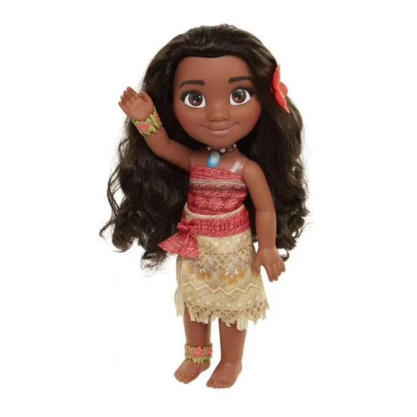 Poupée Vaiana de 38 cm. La poupée a des yeux avec des paillettes intégrées, une robe à motif avec paillettes et détachable par scratch sur le dos.
