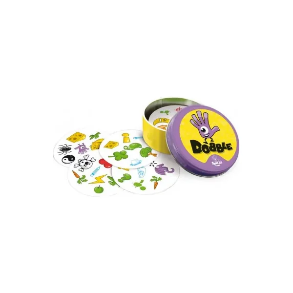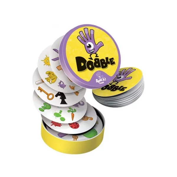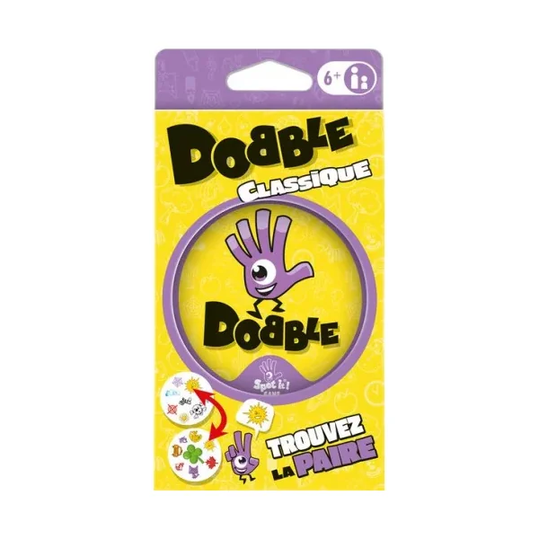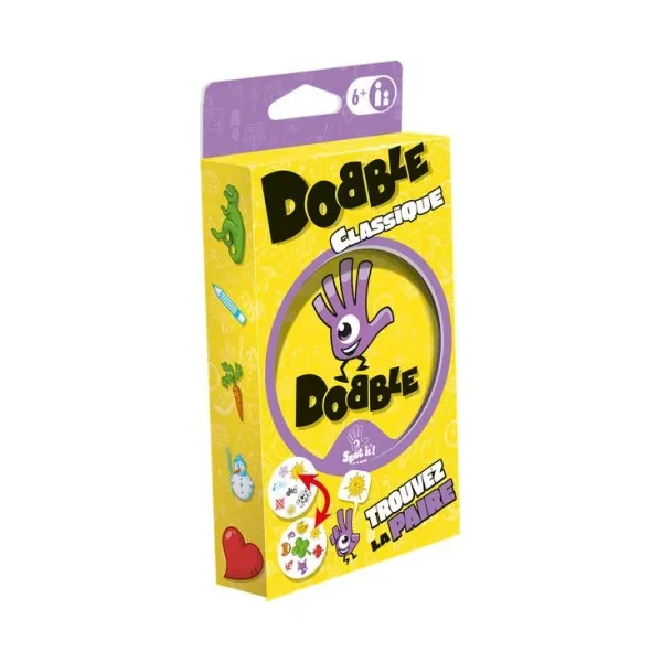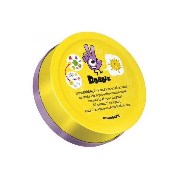 Découvrez le célèbre jeu Dobble, un jeu d’ambiance, d’observation et de rapidité dans lequel tous les joueurs jouent en même temps. Un jeu pour jouer de 2 à 8 joueurs à partir de 6 ans. Dobble, c’est plus de 50 symboles, 55 cartes, 8 symboles par carte et toujours un et unique symbole identique entre chaque carte.