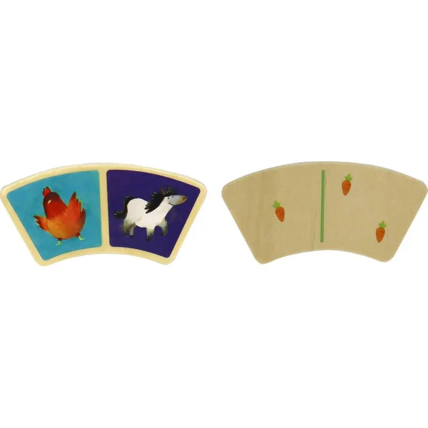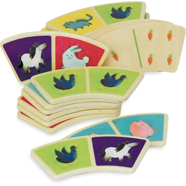 Un magnifique set de dominos en bois, illustré en peinture avec poésie pour jouer au bon air de la campagne. Hummmm, ça sent bon l’odeur de foin et d’étable ! Originales avec leur forme en arc de cercle, les pièces sont assez grosses pour que les petits puissent les assembler facilement et y jouer en toute sécurité. Contenu : 28 dominos en bois.