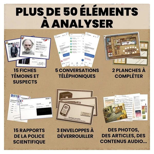 Contient des témoignages, des analyses de la police scientifique, des articles de presse, des photos de la scène de crime, des contenus audio… Information : Attention, présence de petits éléments, risque d’étouffement. Ne convient pas aux enfants de moins de 36 mois. FAQ