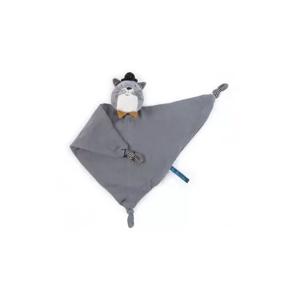 Découvrez le doudou lange Fernand de la collection Les moustaches de Moulin Roty, un joli doudou plat en tissu lange gris foncé avec sur la jolie frimousse du chat Fernand. Un adorable cadeau pour les filles et les garçons.