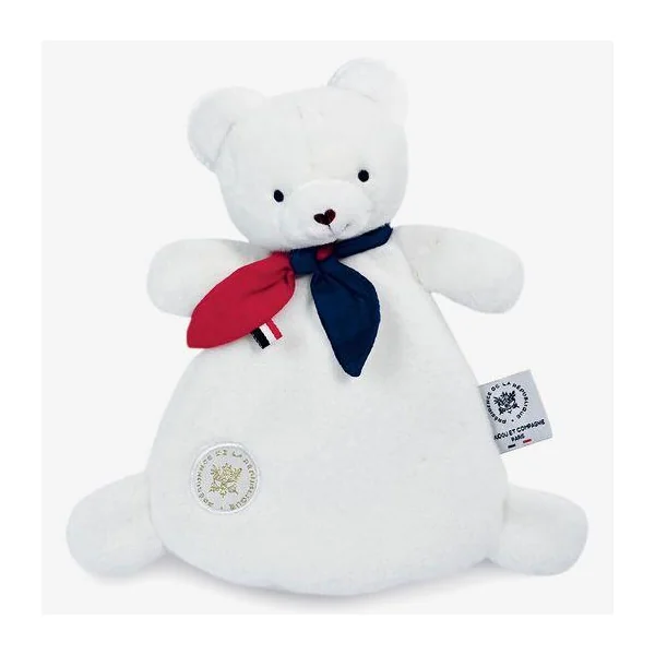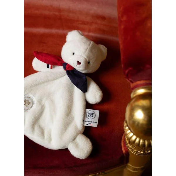 Doudou et Compagnie s’associe à l’Elysée pour faire valoir son savoir-faire français. De cette collaboration est née ce charmant Doudou blanc, ultra doux, élégant et raffiné avec ses fines broderies dorées. Petit nez en forme cœur pour le côté trop chou et foulard bleu et rouge sur Doudou blanc pour la symbolique tricolore française. C’est un parfait hommage à la fabrication française si appréciée et enviée. Lavage à 30°, séchage mécanique à basse température.