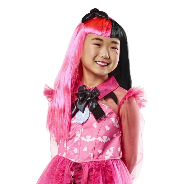 Une perruque longue rose et noire avec frange pointue. / Age: 3 ans