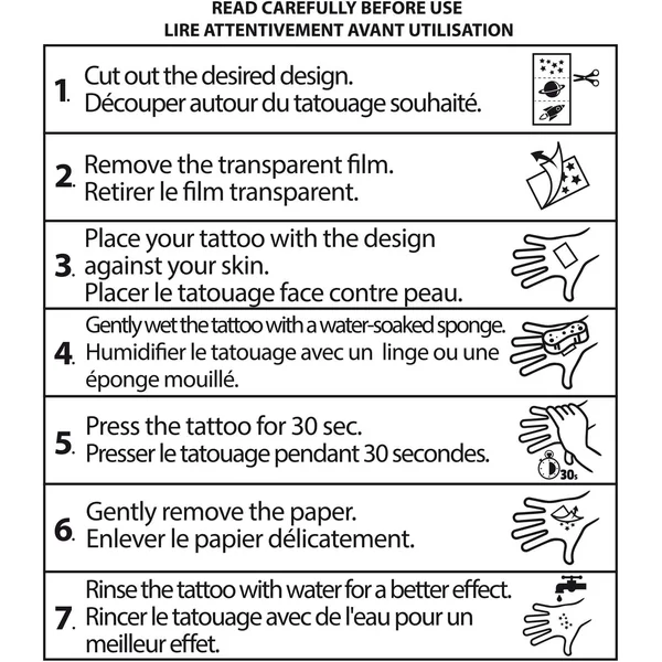 - Utilisation facile et rapide : pressez le tatouage contre votre peau pendant 30 secondes à l’aide d’un linge humide et enlevez délicatement.