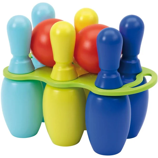 6 quilles de bowling géantes de 30 cm assorties + 2 boules rangées sur un support avec poignée.