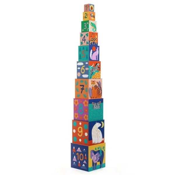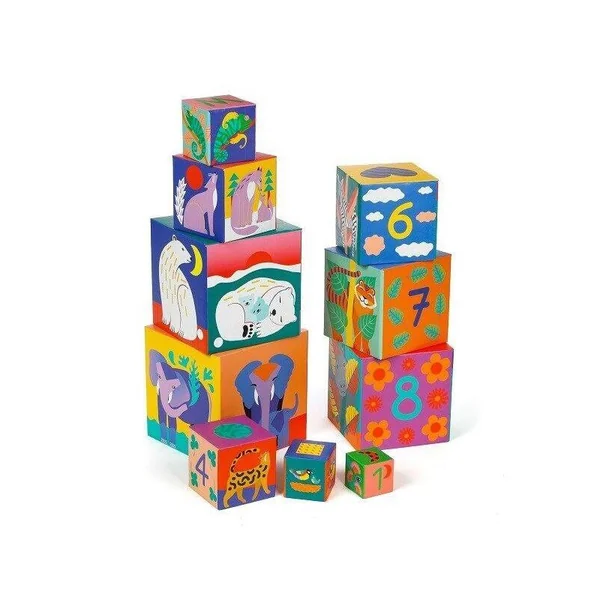 Des cubes gigognes aux illustrations graphiques et colorées. 10 cubes en carton épais à emboîter, empiler et faire tomber à volonté !