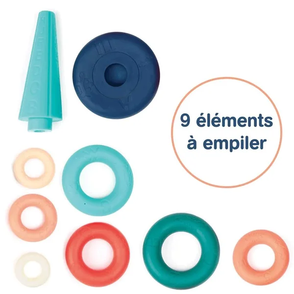 La jolie pyramide forme un jeu d’empilement et d’équilibre. Les 8 anneaux souples doivent être remis dans l’ordre sur la tige centrale.