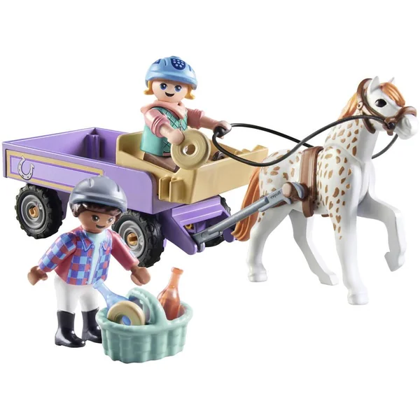 Montez dans l’adorable calèche PLAYMOBIL et rejoignez les enfants dans leur sortie. Les deux passionnés de poneys profitent du beau temps et partent en balade avec leur poney préféré. Pour se rafraîchir, ils ont un panier pique-nique avec de délicieux beignets et des boissons fraîches. Ce set comprend deux personnages d’enfants, un poney, une calèche, des casques, un panier de pique-nique et d’autres accessoires. Les personnages d’enfants peuvent monter les poneys sans selle. La nouvelle gamme Horses of Waterfall est fabriquée avec plus de 80% de matériaux recyclés ou biosourcés en moyenne. Avec 2 personnages, 1 poney, 1 chien et des accessoires. 33 pièces.
