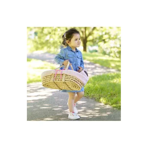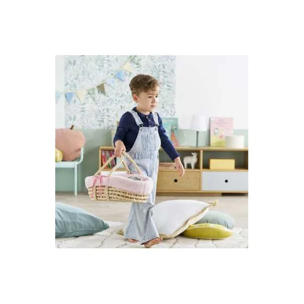 Très pratique avec ses poignées, votre enfant pourra promener son poupon dans ce couffin en tissu. Le couffin contient une couverture réversible et un oreiller afin de bien tenir au chaud bébé.