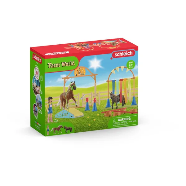 Les figurines Schleich® sont toutes sculptées avec des détails plein de réalisme pour des moments de jeu pédagogiques. Les poneys se familiarisent techniquement avec les nombreux obstacles de l’entraînement d’agility. Ils doivent d’abord les renifler allègrement. Ensuite, les poneys en font le tour, montent dessus ou passent à travers avec précaution. Pour certains obstacles, les poneys doivent vraiment faire preuve de courage. Il faut donc être patient et les encourager avec tendresse. Obstacles combinables avec possibilités d’agencement infinies ! Adapté aux petits et grands chevaux Schleich® ! Enfant avec bras et jambes mobiles ! 1x poney classique, 1x poney shetland, 1x jeune fille, 1x bombe, 1x harnais, 1x longe, 1x porte d’accès, 8x paddock, 1x bascule, 4x cône, 4x obstacle souche d’arbre, 2x barre, 2x ballon, 1x socle, 1x porte voûtée, 4x fanion, 1x barre transversale, 5x rideau, 1x feuille d’autocollants.