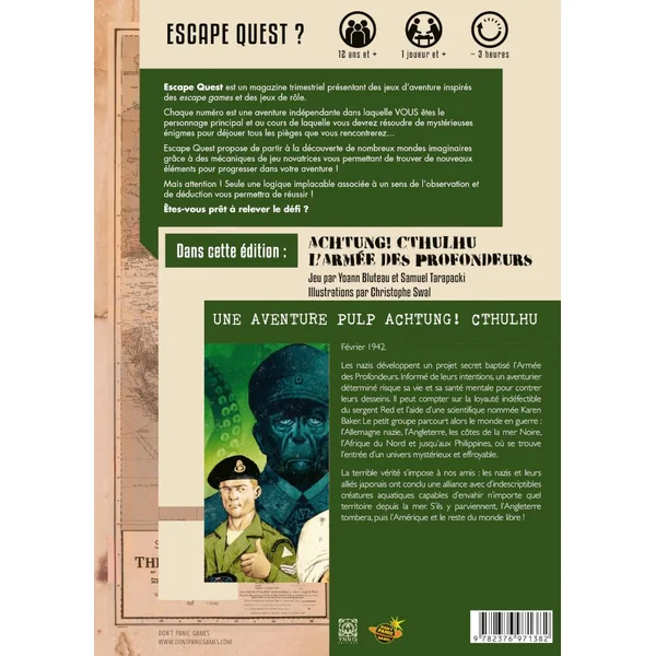 Escape Quest est un magazine trimestriel présentant des jeux d’aventure inspirés des escape games et des jeux de rôle. Chaque numéro est une aventure indépendante dans laquelle VOUS êtes le personnage principal et au cours de laquelle vous devrez résoudre de mystérieuses énigmes pour déjouer tous les pièges que vous rencontrerez…